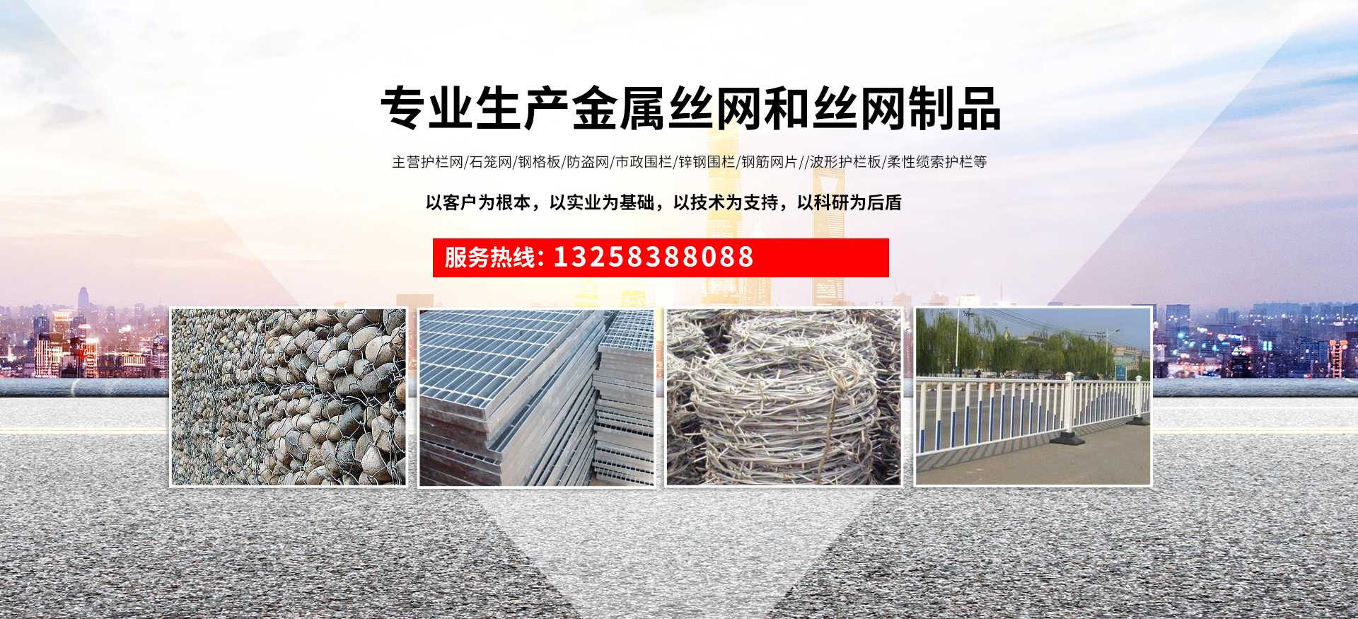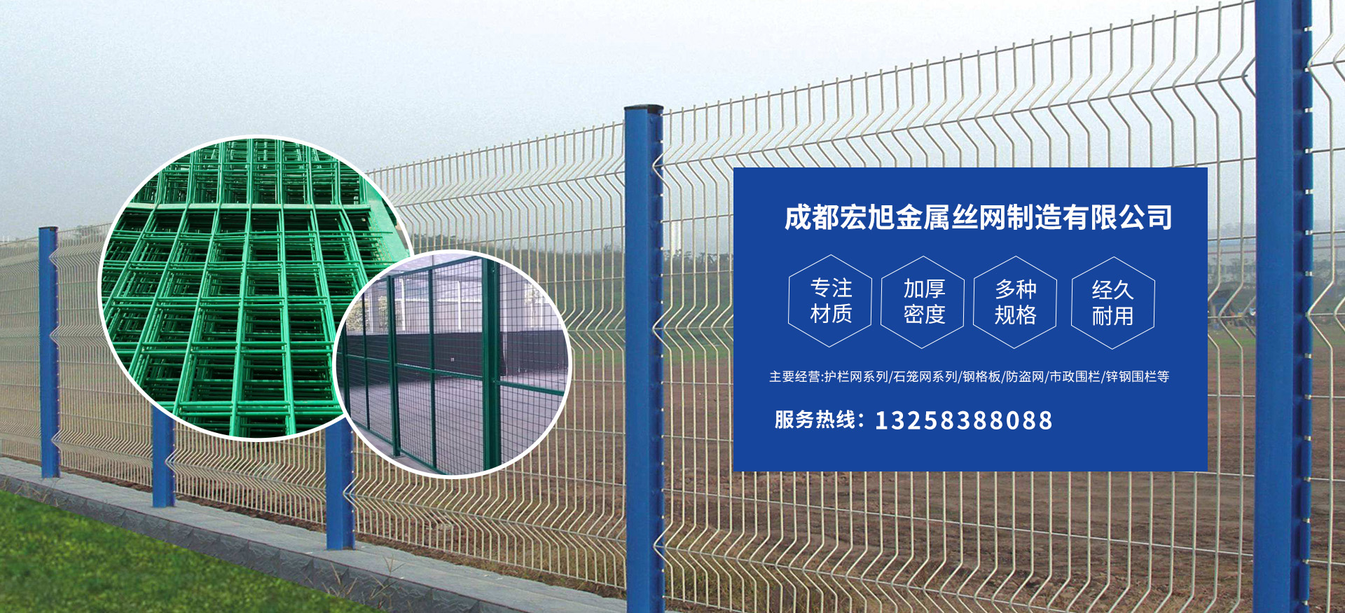 成都宏旭金屬絲網(wǎng)制造有限公司主營(yíng)護(hù)欄網(wǎng)系列、石籠網(wǎng)系列、鋼格板、防盜網(wǎng)、市政圍欄、鋅鋼圍欄、鋼筋網(wǎng)片、聲屏障系列、波形護(hù)欄板、柔性纜索護(hù)欄、SNS邊坡防護(hù)網(wǎng)等其他絲網(wǎng)類產(chǎn)品。特殊規(guī)格可加工定做,也可根據(jù)客戶來(lái)圖來(lái)樣定做。自創(chuàng)業(yè)以來(lái),公司一直堅(jiān)持市場(chǎng)為導(dǎo)向,以客戶為根本,以實(shí)業(yè)為基礎(chǔ),以技術(shù)為支持,以科研為后盾,集科研、生產(chǎn)、經(jīng)營(yíng)為一體,不斷研制開(kāi)發(fā)新產(chǎn)品,開(kāi)拓市場(chǎng),走綜合發(fā)展之路。多年來(lái),公司憑借過(guò)硬的質(zhì)量,良好的信譽(yù)、優(yōu)質(zhì)的服務(wù)、合理的價(jià)格,贏得了市場(chǎng)和商家的一致好評(píng)。